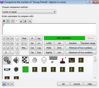 Кликаем на условие – Insert – Friends – Pick or count – Compare to the number or “Group.Friends” objects in a zone и снова перемещаем окно на наши ячейки внизу. В появившемся окне выбираем Lower or equal, 7.