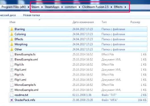 Затем перенесём файлы из архива в папку с Clickteam Fusion.