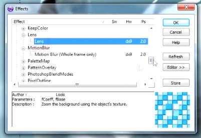 Добавим для активного объекта эффект линзы: Properties – Effects – Lens – OK.