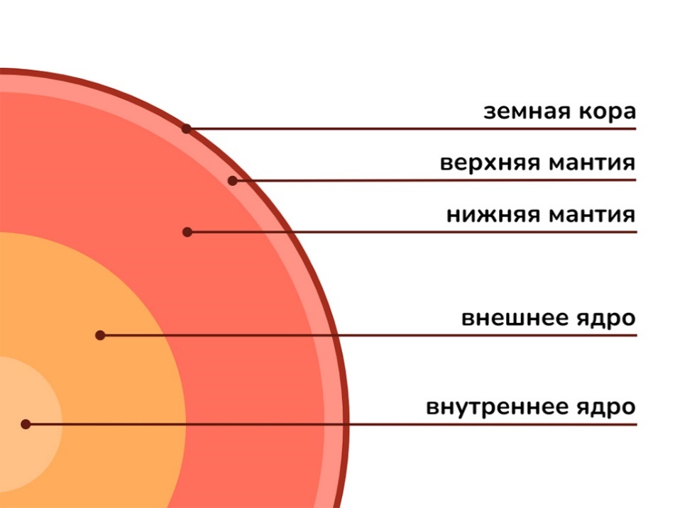 Рис. 1. Строение Земли. По сравнению с мантией и ядром земная кора очень тонкая, однако она важна для понимания истории нашей планеты (схема автора)