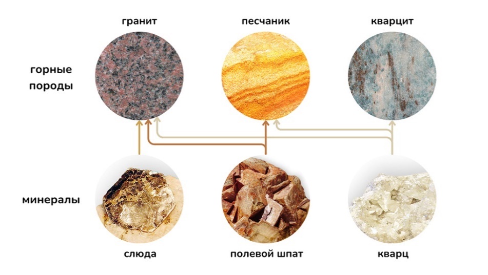 Рис. 3. Примеры горных пород и минералов (схема автора, фото: см. «Источники иллюстраций»)