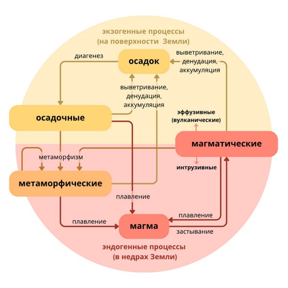 В природе постоянно происходит цикл преобразования горных пород: в течение миллионов лет одни типы пород постепенно превращаются в другие (см. рис. 5).