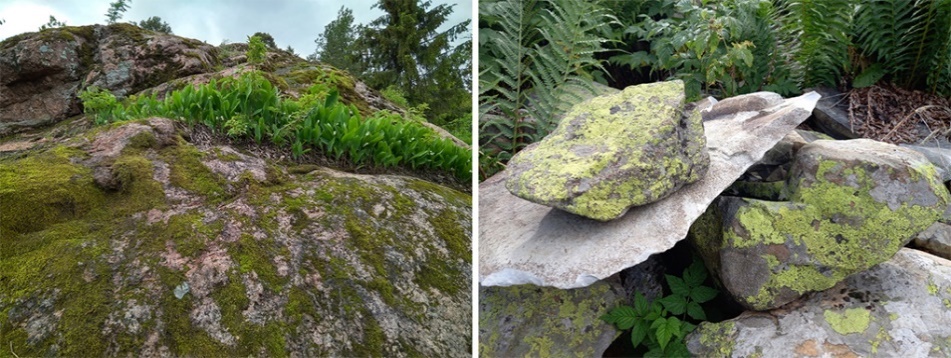 Рис. 7. Биологическое выветривание (растения и лишайники). Слева: Выборг, Ленинградская область; справа: хребет Аибга, Краснодарский край (фото автора)