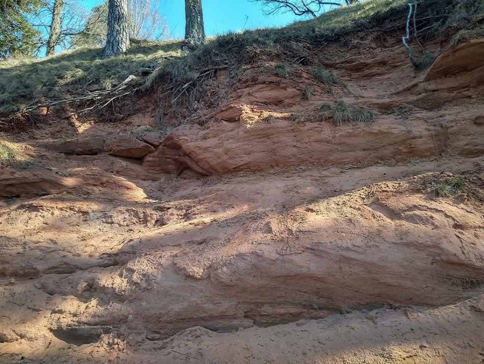 Рис. 8. Древний красный песчаник (олдред) на берегу реки Оредеж в Ленинградской области. Накопление осадков, образовавших этот песчаник, происходило более 382 миллионов лет назад, в среднем девоне (фото автора)