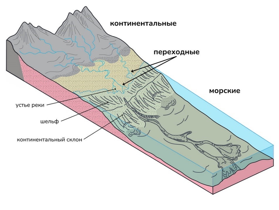 Обстановки осадконакопления и, соответственно, осадочные фации делятся на континентальные, переходные и морские (см. рис. 10).