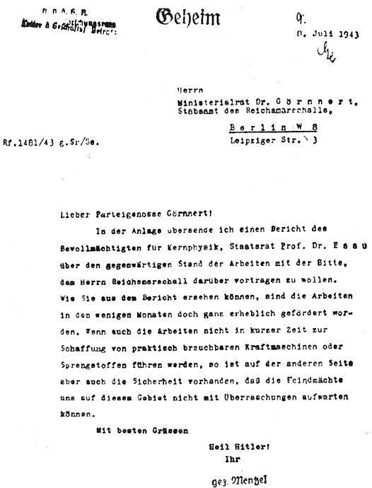Посылаю Вам для информации Рейхсмаршала [Геринга] доклад уполномоченного по ядерной физике Государственного советника профессора доктора Эзау. Как видно из доклада, за несколько месяцев дело довольно значительно продвинулось вперед. Эта работа не может за короткое время привести к изготовлению практически применимых машин или взрывчатых веществ, поэтому можно быть уверенными, что в данной области вражеские державы не могут иметь в запасе какую-либо неожиданность для нас.