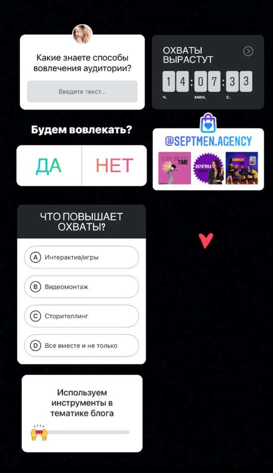 11 и больше – это круто, но здесь нужно быть аккуратным. Большое количество сторис нужно делать очень интересными , чтобы удерживать внимание аудитории и не надоесть. Кстати, отлично работает рубрика Вопрос-Ответ. Людям нравится читать ответы.