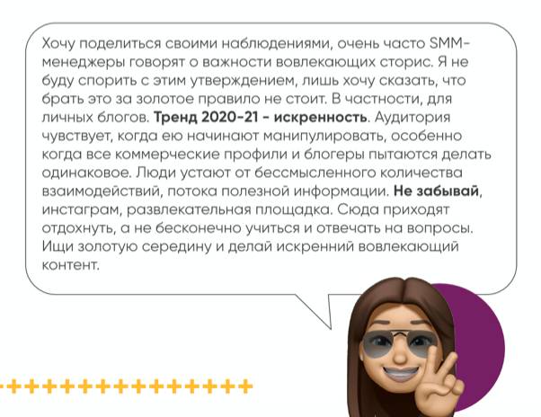 При этом, такой стиль поддерживается на протяжении всего времени, и при открытии сторис подписчик интуитивно понимает, чьи сторис он открыл.