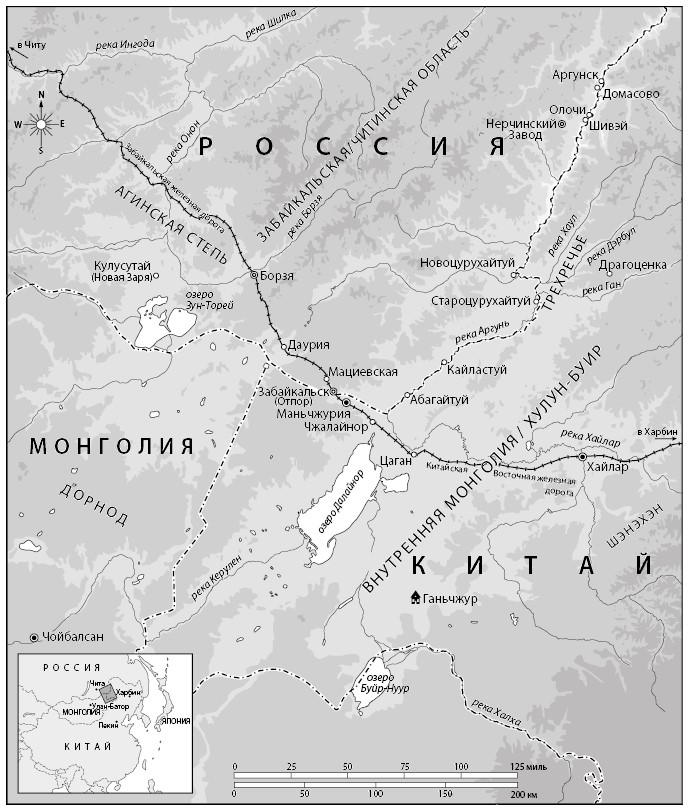 Территория, на которой мы сосредоточим внимание, расположена в сегодняшнем российско-китайско-монгольском пограничном треугольнике в верховьях реки. С севера и востока она ограничена горным хребтом Большой Хинган, а с юга и запада – пустыней Гоби. Территория охватом около семидесяти тысяч квадратных километров соразмерна по масштабам с современной Грузией. Окраины этого региона примерно соответствуют внешним пределам свободной торговой зоны, установленной в 1862 году, и отдельной административной структуре пограничных районов, которые начали создаваться с конца 1920-х годов. Другими словами, окраины этого региона могут быть описаны так: немного пологая равнина Агинской степи, где река Борзя впадает в Онон и обозначает его западные пределы. Казацкая станица Олочи на среднем течении Аргуни отмечает его северный край. Предгорья лесных склонов Большого Хингана, отделяющие плоскогорье Хулун-Буира от Маньчжурской равнины, маркируют его восточные пределы. Река Хайлар – приток Аргуни, которую иногда считают верховьем реки Аргуни, и мелководное озеро Далайнор отмечают ее южную окраину.