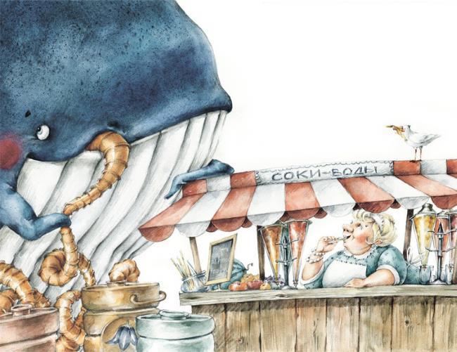 Не успело ещё солнце выпить свой утренний кисель из тумана, как из моря на берег вышел кит[2]. Вернее, китесса. В том, что это кит-девочка, не было никаких сомнений! На голове у китессы была шляпка канотье из соломки (а вернее, из сушёной морской капусты), на плавниках болтался рюкзачок из рыбьей чешуи. Рюкзачок был китовьего размера (то есть не маленький), чешуя на нём блестела и переливалась в лучах восходящего солнца, словно золотые пайетки. На глазах китессы поблёскивали очки из отполированных морем бутылочных стёклышек. Стёклышки были гладкие, матовые, разных цветов – молочного, шоколадного и зелёного. Из-за этой стекольной мозаики очки были похожи на глаза стрекозы (если взглянуть на них под микроскопом).
