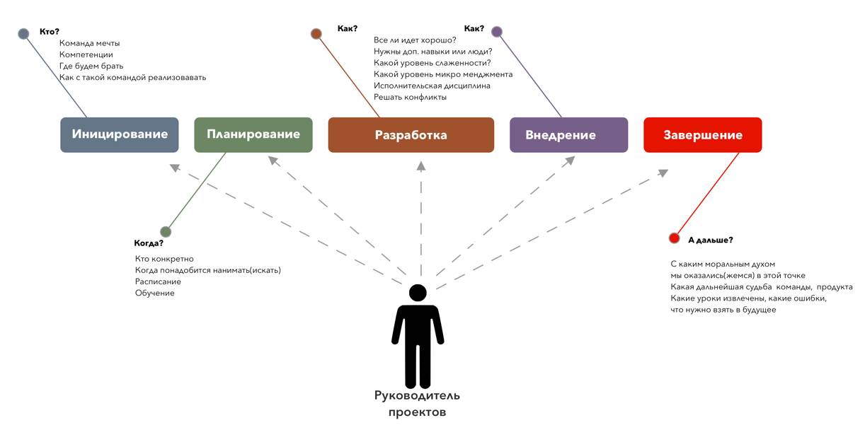 Если в начале проекта РП выполняет только минимальный набор требований касательно команды, то скорее всего на других этапах будут неожиданно всплывать вопросы. А это значит не будет такой предсказуемости и системности, как виделось на старте проекта.
