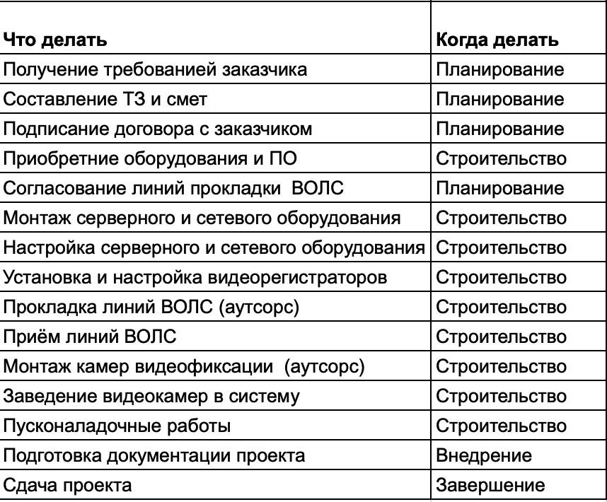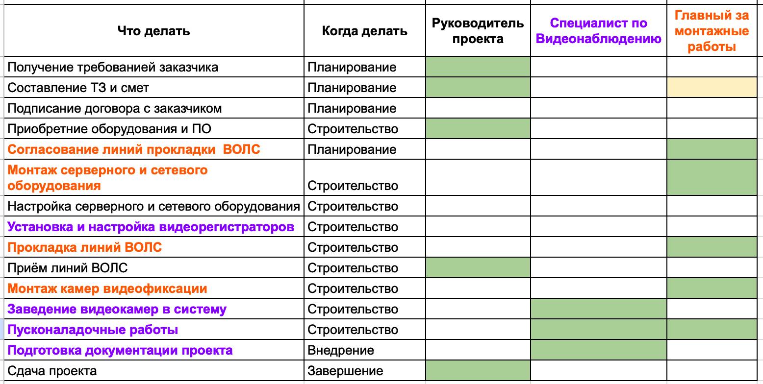 Часть схожих обязанностей, которые оказались запланированы в разные этапы проекта можно объединить под одной персоной. Например, можно попробовать совместить «Специалист по видеонаблюдению» и «Специалист за сервера и сеть» в одном специалисте, потому что очень схожая сфера работ и инструменты, которые они используют. У РП будет несколько опций поиска на рынке специалиста в зависимости что нужно раньше по времени – брать системного администратора и доучивать его видеотехнологиям, или искать готового спеца по видеонаблюдению и догнать навыки по серверам и прочему в процессе проекта.