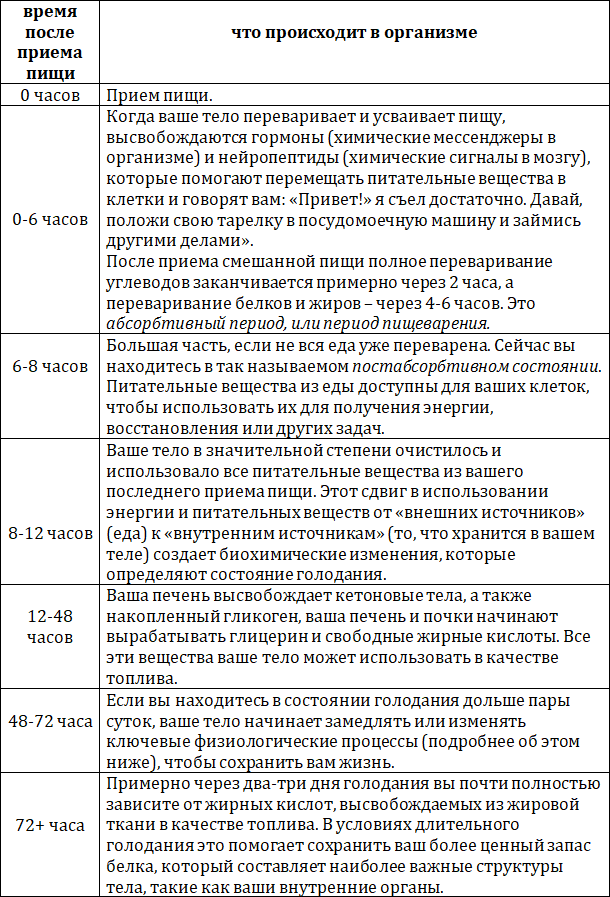 – «голодание» – это метаболическое состояние, в которое организм входит через 8–12 часов без приема пищи. Это определяется переходом в использовании питательных веществ от «внешних» к «внутренним» источникам. Именно этот сдвиг создает биохимические изменения и потенциальные преимущества голодания. (10)