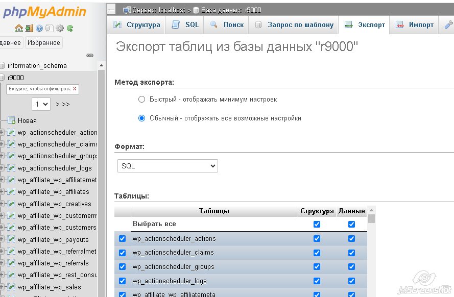 Переходим на phpMyAdmin из панели управления хостингом (вводим логин пользователя и пароль базы данных, если запросит) – экспорт: