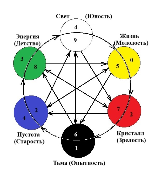 Ток энергии в системе между элементами, происходящий по ходу часовой стрелки, гармонизирует систему. Обратный, происходящий против хода часовой стрелки, приводит систему в дисгармоничное состояние.