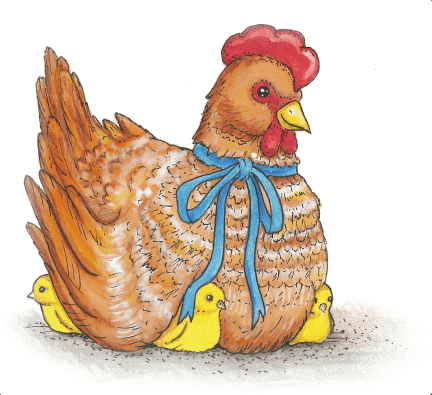 Рядом с ними расположилась пасхальная рябая курочка с красиво завязанным бантом из яркой ленты на шее, а из-под её крыльев выглядывали маленькие жёлтые цыплята. На соседних полках шкафов и витрин стояли фарфоровые и деревянные домики, вазы, мельницы, карусель с лошадками и много других занятных вещиц.