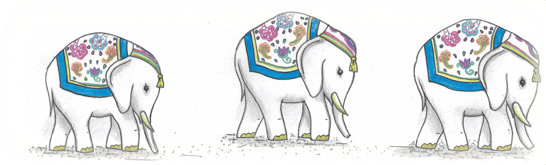 Также неподалёку стояла семья фарфоровых слонов, их было ровно семь. У слонов, что повыше и постарше, рядом с хоботами торчали мощные бивни. Их было по одному с каждой стороны хобота. Могучие спины слонов прикрывали одинаковые расписные попоны. Первый слон был самым высоким и большим, а заканчивалось это семейство крошечным слонёнком-малюткой.
