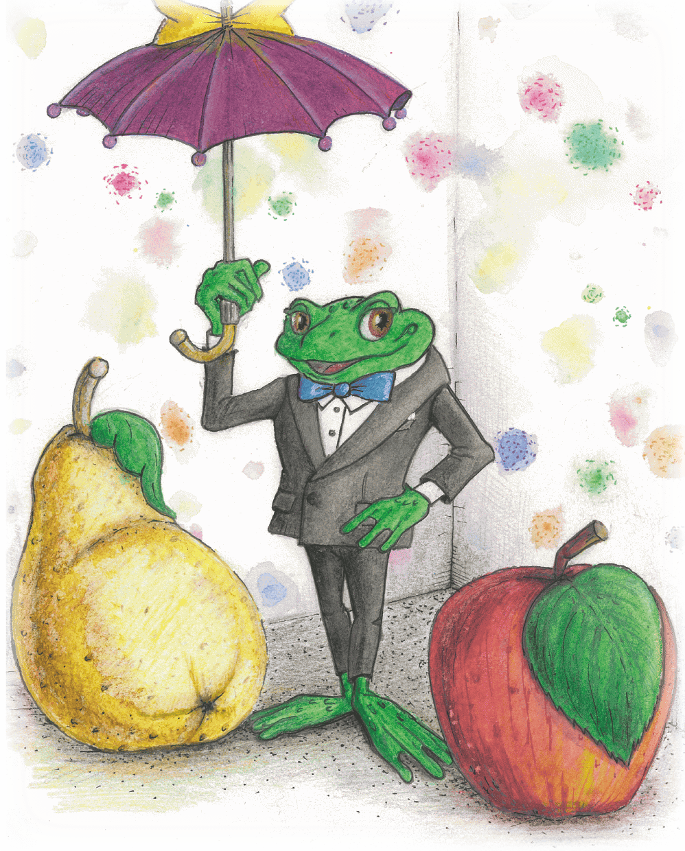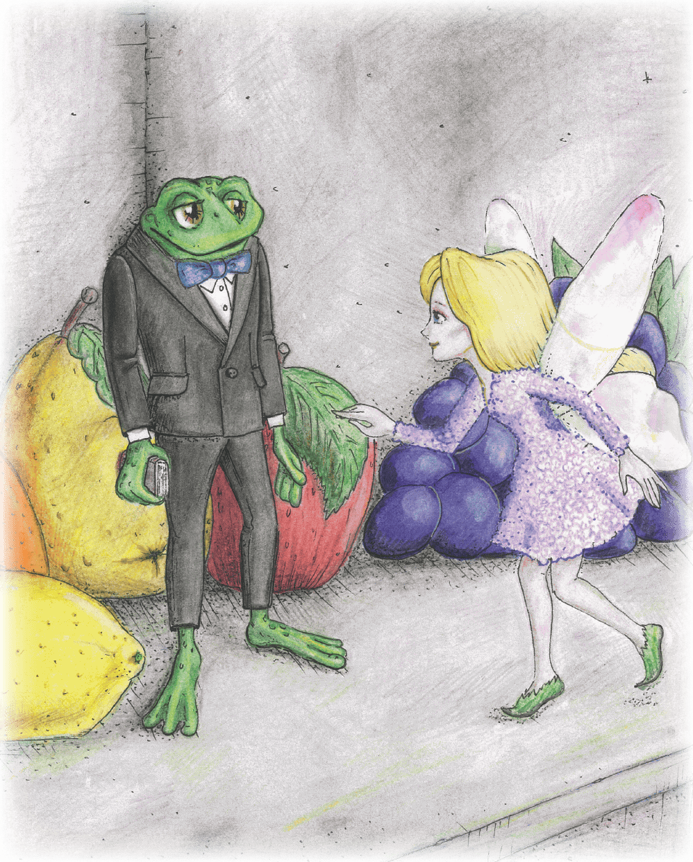 Внимание малышки феи привлёк небольшой фарфоровый лягушонок. Он стоял в глубине шкафа, на полке, среди фарфоровых фруктов и овощей. Лягушонок необычно выглядел, на нём были надеты чёрный смокинг, белая рубашка, на его шее красовалась яркая синяя бабочка, из нагрудного кармашка торчал светлый платочек. Но вот почему-то брюки у него были коротковаты, а на его лапках не было башмаков. Он был совершенно босой и от этого выглядел необычно, может, даже немножко смешно. В одной лапке лягушонок держал маленькую книжицу. Всем своим видом он умилял фею.