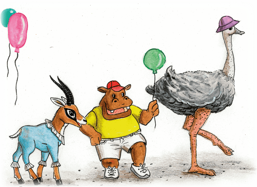 Там стояли зайцы-франты со своими дамами-зайчихами. На зайцах были надеты элегантные костюмы-тройки в мелкую клетку, а на их головах красовались высокие шляпы-цилиндры. В лапках они держали трости, а на их мордашках были нацеплены металлические очки-пенсне. На дамах-зайчихах были красивые шёлковые платья. В лапках они держали кружевные зонтики от солнца и небольшие сумочки. Шляпы с цветами и перьями на полях обрамляли их ушастые головки.