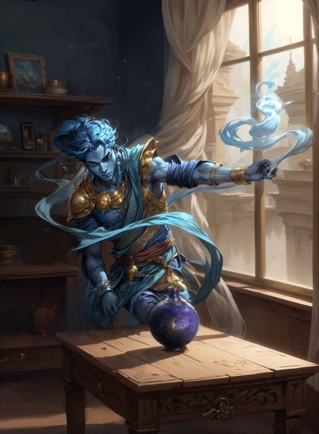 Осторожная девушка-археолог завороженно взглянула на появившийся пред ней старинный сосудик, легонько на носочках подошла к нему, внимательно осмотрела его со всех сторон, не забывая крепко прижимать к груди грозный молот, ведь мало ли что вылезет оттуда какая-нибудь змея, медоед или фи… таракан какой-нибудь. Подойдя поближе, она медленно положила молот, не отрывая взгляда от сосуда, и взяла, непонятно зачем лежащую у нее дома, кочергу. Легонько потыкала кончиком кочерги по разным местам сосуда. Но ничего не произошло. … Девушка недоверчиво прищурила правый глаз, и, не отрывая взгляда, взяла в руку щипчики, потыкала ими в разные места кувшинчика: снова ничего не произошло. Приподняв курносый носик рассудительная девушка-археолог осторожно отложила все предметы на пол и решила дотронуться пальчиком до гладкой, как ее щечка, крышечки сосуда и чуть-чуть потерла ее. В этот самый момент сосудик шелохнулся, а из-под крышечки поднялся небольшой радужный туман. Озадаченная девушка-археолог стояла, как вкопанная, и продолжала смотреть на сосуд, не отрывая взгляда от чудо-юдо сосуда, но сосуд снова стоял как ни в чем не бывало, а радужный туман куда то пропал… Удивленный взгляд нетерпеливой девушки-археолога сменился на уставший. Она отошла к раковине, взяла стакан и прополоскала рот видимо для …, хотя только она знает по какой причине. И тут глядь, в этот самый момент, откуда ни возьмись, из сосуда вновь начали валить клубы радужного дыма, заполоняя всю комнату. Крышка сосуда полностью открылась и из-под нее на свободу вынырнуло что-то синее и прошмыгнуло по комнате, затем пролетело несколько раз вокруг сосуда. Затем прошмыгнуло обратно внутрь сосуда и вылетело вновь. Выныривая из сосуда, словно рыбка, существо от радости и бесценной свободы виртуозно начало летать по всему дому, превращаясь то в чужестранную канарейку, то в экзотического дракончика, то вовсе в неведомую доселе птичку, то плавно кружась и изворачиваясь в полете, то резко взлетая, словно ракета, то кружась, как снежинка, то словно бумажный самолетик планируя и витая по воздуху, то словно бабочка-однодневка порхая и извиваясь. В конце концов рея и снижаясь, уставшее от радостных изворотов непонятное существо упало на пол перед очаровательной девушкой-археологом.