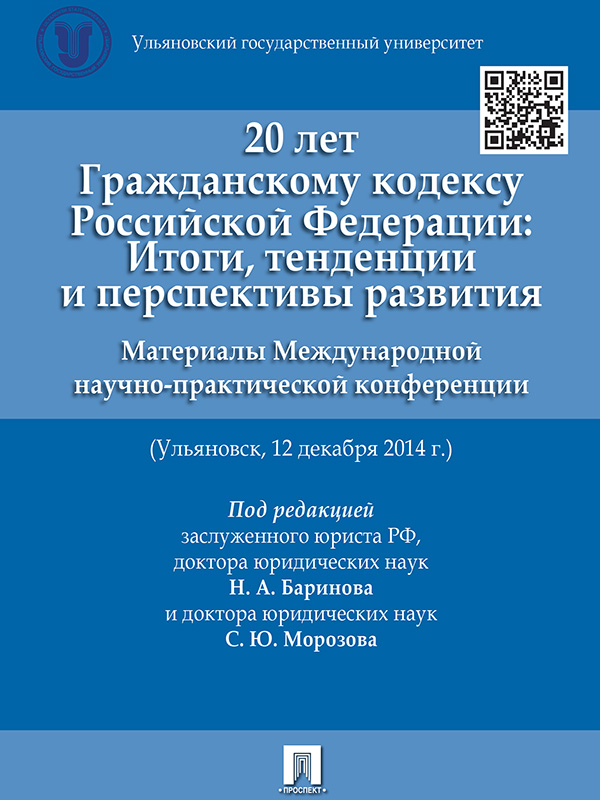 12 декабря 2014 г. в ФГБОУ ВПО «Ульяновский государственный университет» прошла Международная научно-практическая конференция, посвященная 20-летнему юбилею Гражданского кодекса Российской Федерации. В конференции приняли участие ученые России, Австрии, Китая, Франции, Республики Беларусь и Таджикистана. В издании представлены доклады выступлений и статьи российских и зарубежных участников конференции, которые посвящены итогам и перспективам развития гражданского законодательства.