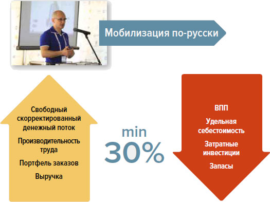 Посмотрите на такой залихватский слайд Сергея Владиленовича Кириенко из доклада на конференции «Люди Росатома» 2014 года. Мобилизация по-русски. От японцев я прятал этот слайд. Он бы вызвал у них полное недоумение. Почему 30 %? Кто и как посчитал? А никто не считал. Цель поставлена – выполняйте, там разберемся. Но это работало!