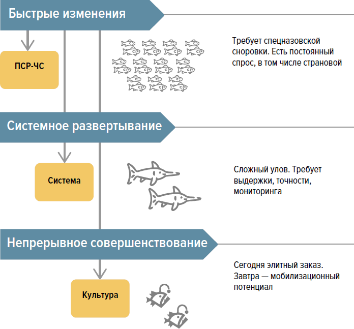 2. Очень сложно, а скорее, невозможно будет соединить лучшие мировые модели управления (японскую TPS, американскую BPS – Boeing Production System, европейские модели Lean и нашу научную организацию труда, производства и управления 30-летней давности)Эта наша первоначальная идеология, согласно которой мы должны соединить несоединимое, скорее была агитационно-пропагандистским подходом, хотя мы тогда в это искренне верили. Сейчас становится понятным, что такое соединение может быть даже вредным: мы потратим время не на то. Видимо, надо перенимать у всех все, но больше опираться на свое творческое начало и учиться умело маневрировать в разнообразии подходов – ЧС, система, культура, – не отдавая явного преимущества ни одному из них. Эта логика касается предбоевой стабильной ситуации.