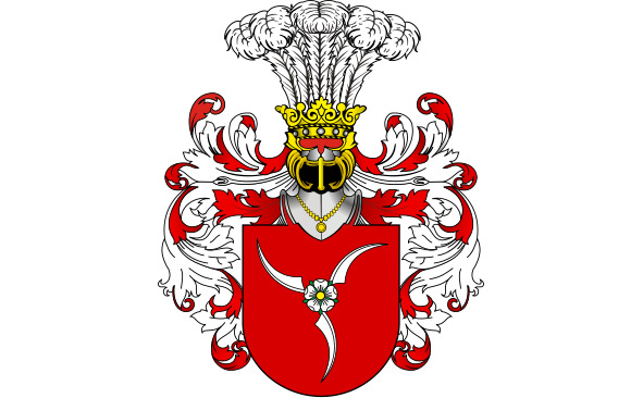 В поле червлёном белая роза, в которую тупыми концами упираются три сошника, остриями обращённые к стенкам шита. На шлеме пять страусовых перьев. Начало этого герба относят к XI веку.