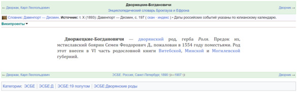 «Энциклопедический словарь Брокга́уза и Ефро́на» (сокр. ЭСБЕ) – универсальная энциклопедия на русском языке, изданная в Российской империи частным акционерным издательским обществом «Ф. А. Брокгауз – И. А. Ефрон» (Петербург) в 1890, 1907 годах. Здесь упоминаются Дворжецкие-Богдановичи.