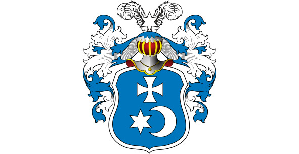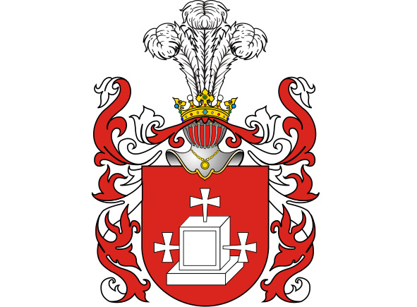 В красном поле – серебряная кубическая могила, в центре – один золотой крест, а по бокам, параллельно основанию, вонзены ещё два креста. Три или пять страусиных перьев в нашлемнике. Намёт на щите красный или чёрный, подложенный серебром.