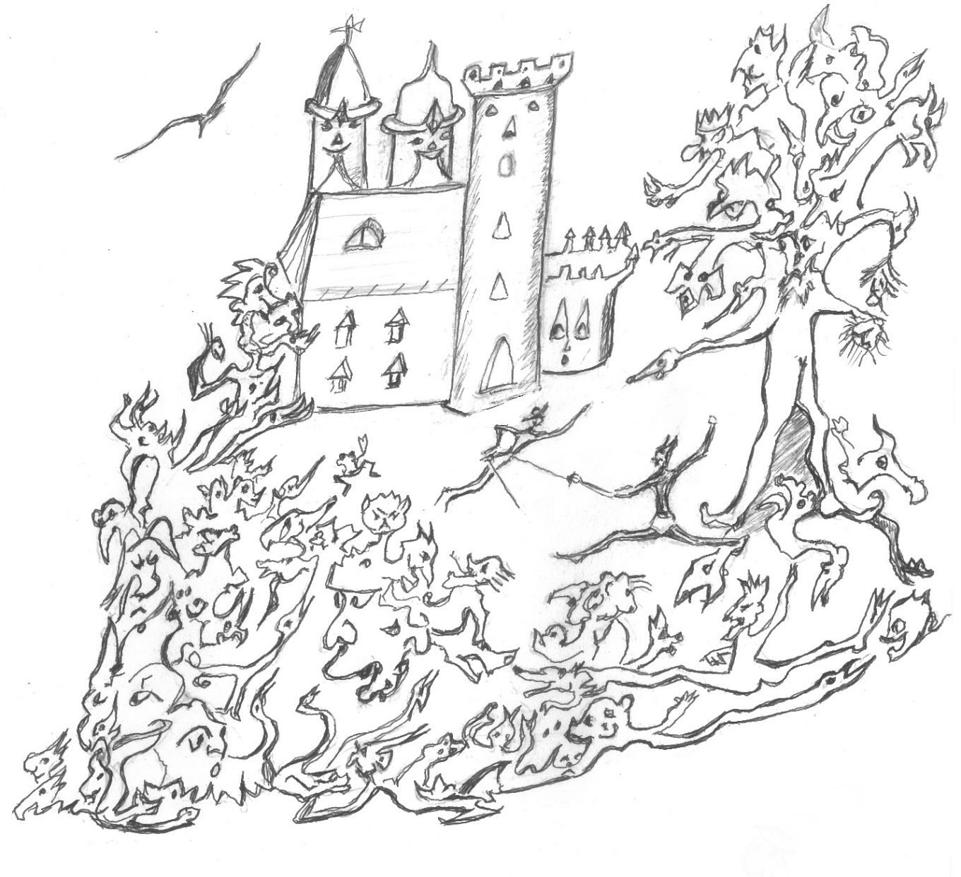 Метрах в пятистах над ними несся, рассекая воздушные струи, сигарообразный летательный аппарат. Под ним на канатах покачивалась двухпалубная гондола. Из кормы торчали две горизонтальные трубы, из которых вылетали искры, клубы дыма, языки пламени. По бортам тройными рядами свисали шары, утыканные длинными красными шипами, из бойниц торчали жерла орудий, вылитые из какого-то невесомого сплава. Размеренно пыхтели гигантские меха, поднимая давление в вытянутом куполе. Из его отверстия, выведенного за корму, с интервалом в несколько минут вырывалась длинная струя пара. Его направленный поток придавал кораблю устойчивую скорость и маневренность. Нос заканчивался длинными абордажными крючьями.
