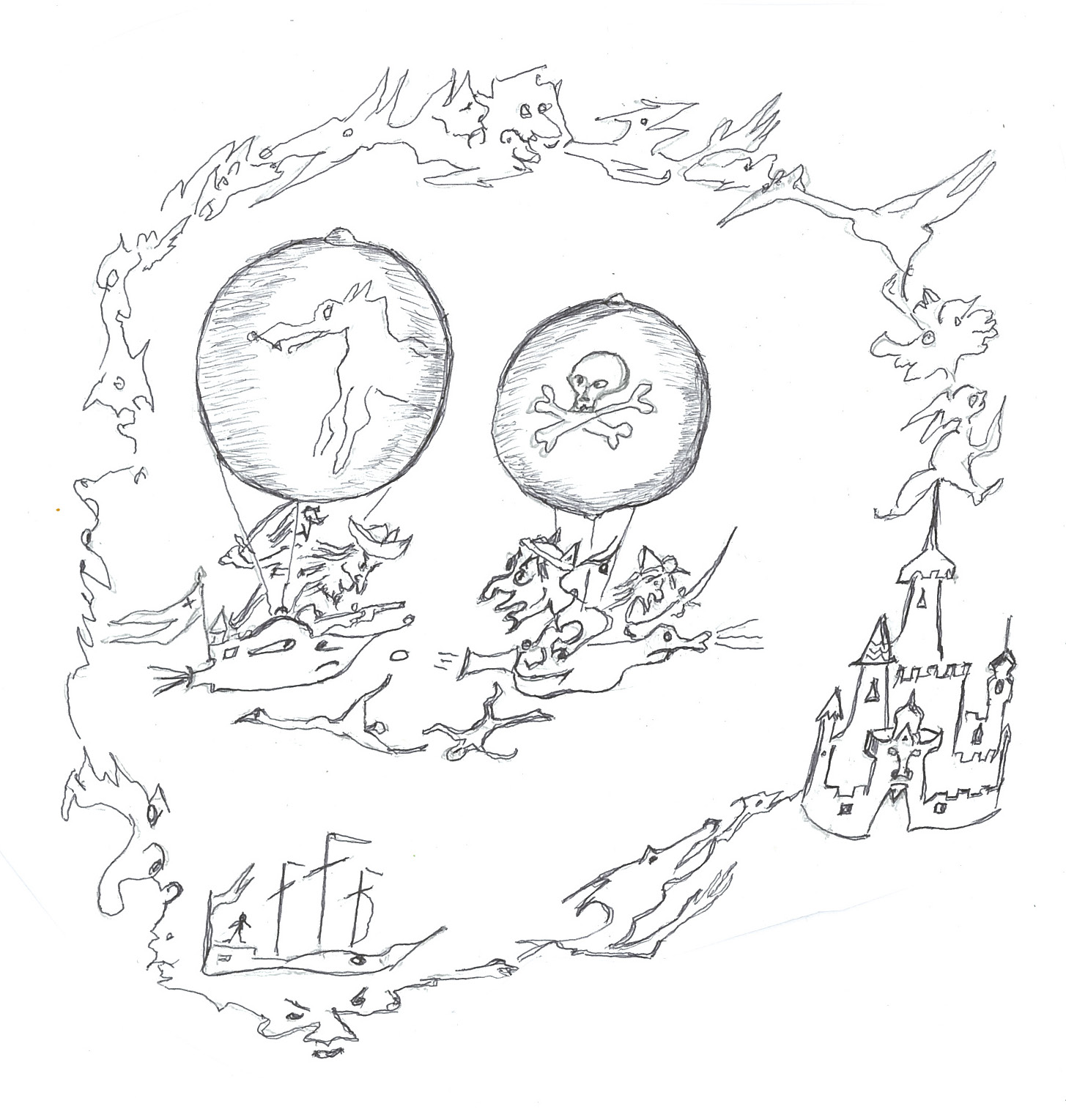 Над ней летел воздушный шар неправильной формы в виде головы монстра с широко открытыми глазами. Под ним на канатах раскачивалась корзина, в которой копошились люди.
