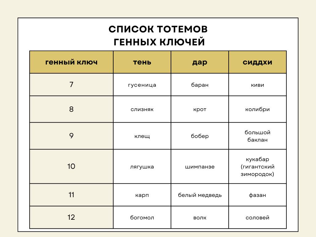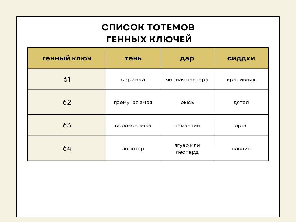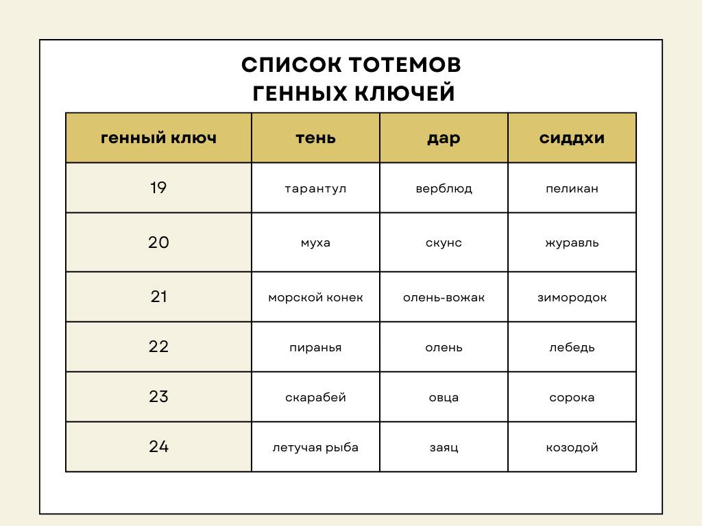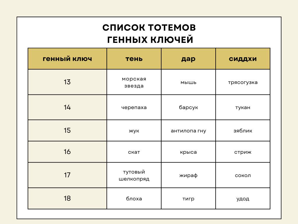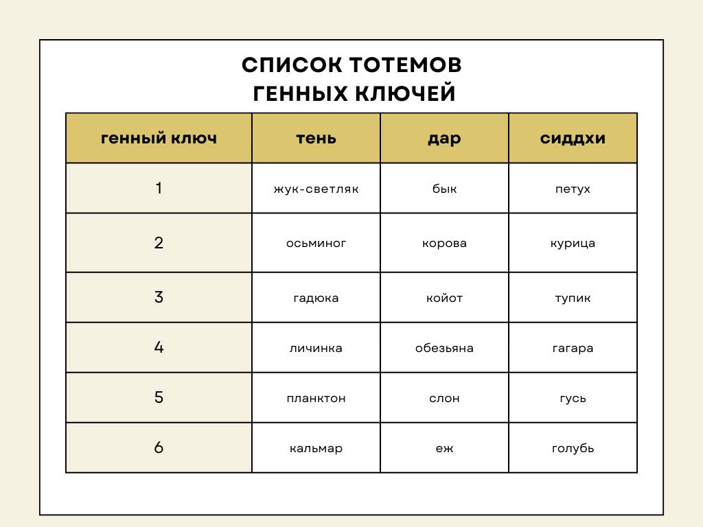 Важно отметить, что таблицу наименований тотемов генных ключей дал Ричард Радд, но сама интерпретация этих символов, представленные в данной книге, работа автора и является индивидуальной версией. Однако в процессе создания материала, автор будет неоднократно обращаться к текстам генных ключей.