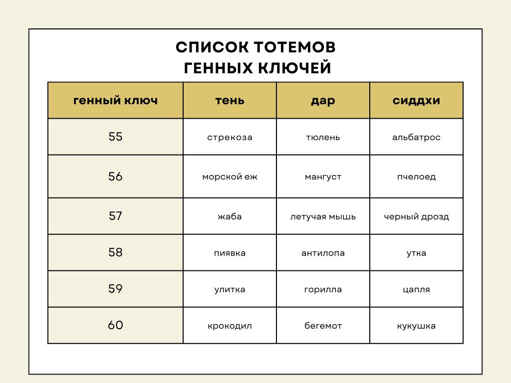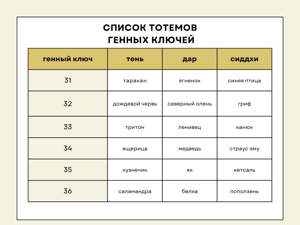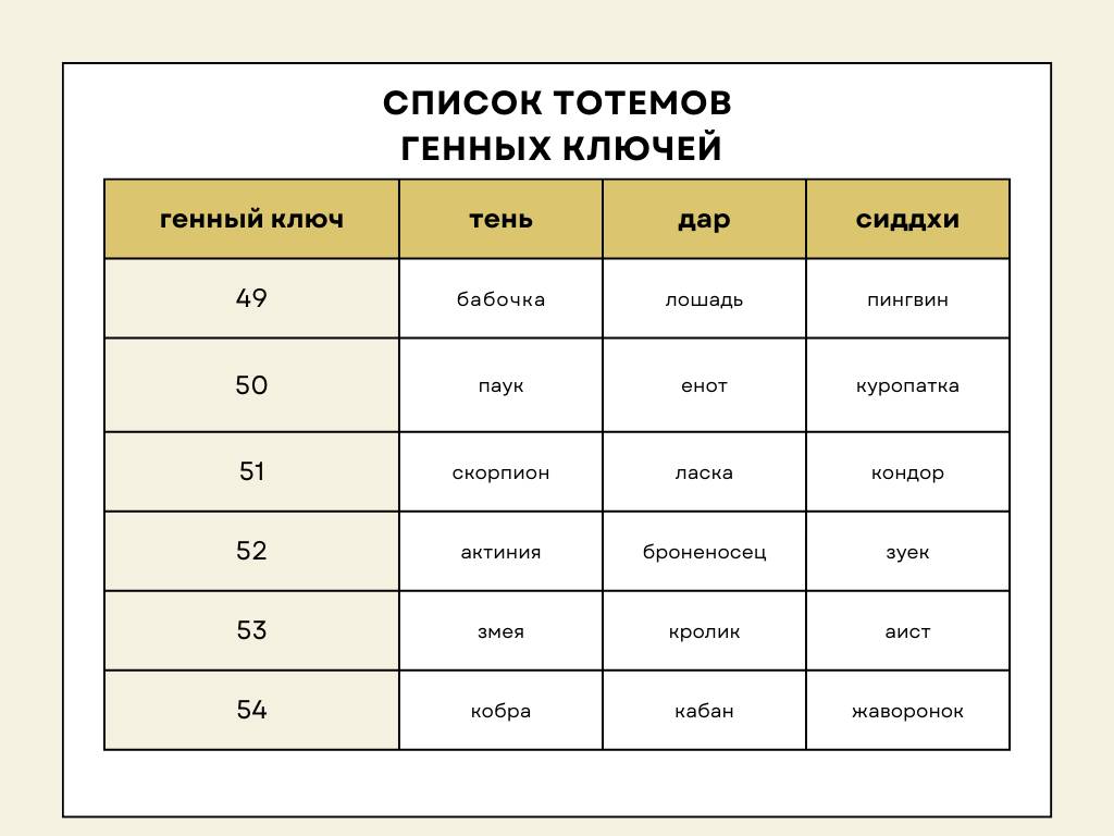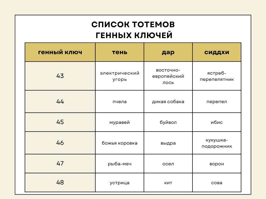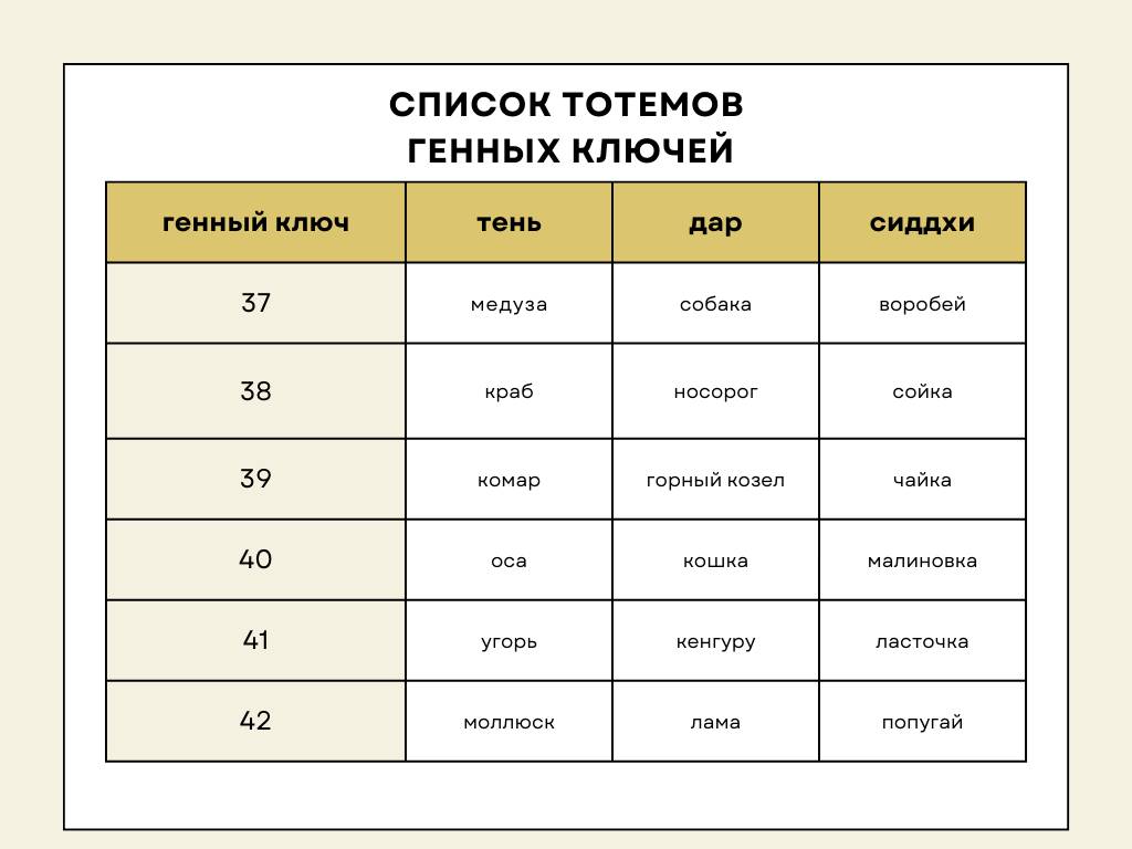 Важно отметить, что таблицу наименований тотемов генных ключей дал Ричард Радд, но сама интерпретация этих символов, представленные в данной книге, работа автора и является индивидуальной версией. Однако в процессе создания материала, автор будет неоднократно обращаться к текстам генных ключей.