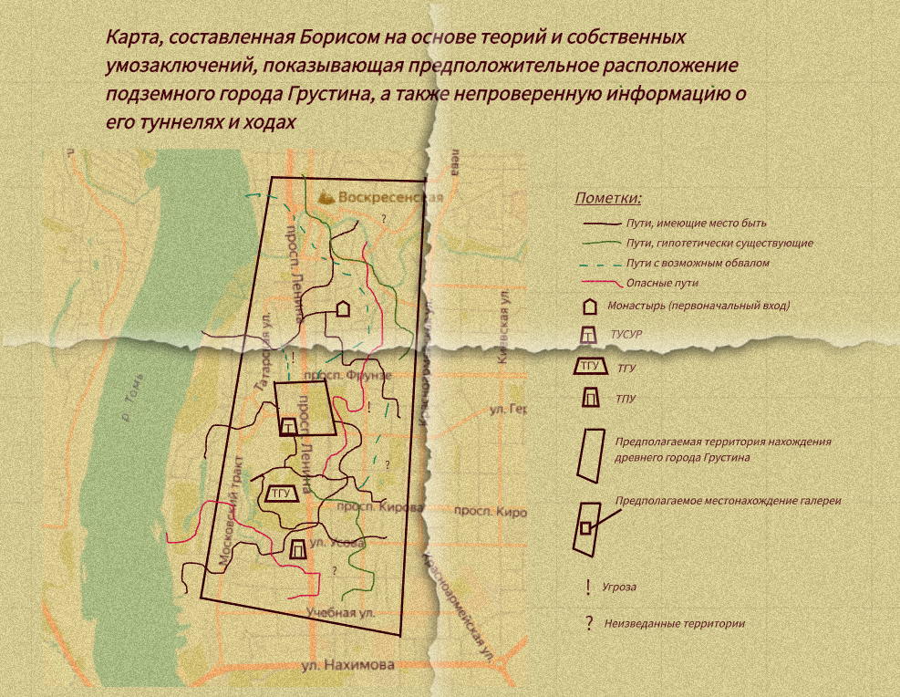 Я наклонился над бумагой и только сейчас заметил множество предполагаемых путей под городом. Галерея, если таковая и была, представляла собой относительно не такой огромный, по меркам с древним городом, квадрат, находящийся под Новособорной площадью и зданием главного корпуса ТУСУРа.
