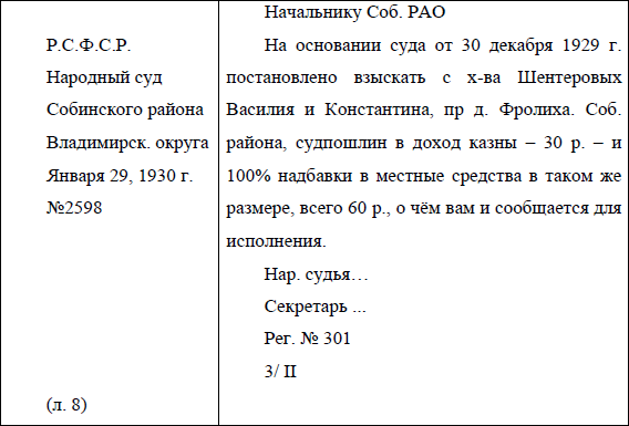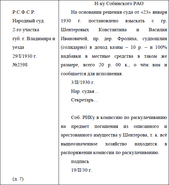 В архиве Собинского районного суда удалось найти документальное подтверждение данного факта. Очевидно, что Василию и Константину не удалось в судебном порядке получить часть имущества в свою пользу (и тем самым спасти его от последующей экспроприации).