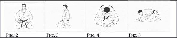 К началу занятия ученик должен сесть на Tatami и принять позицию Seydza, т.е. опуститься на колени, сведя большие пальцы ног вместе или скрестив их. Сначала следует опуститься на левое колено, затем на правое. В момент опускания на колено ступни должны быть перпендикулярны полу. Когда тело опускается на бедра, нужно вытянуть ступни и пальцы ног. Расстояние между коленями у мужчин должно составлять два кулака, женщины должны свести колени вместе. Вес тела в основном сконцентрирован на пятках. Руки должны располагаться на верхней части бедер ладонями вниз. В некоторых школах боевых искусств ладони неплотно сжимают в кулак. Спина должна оставаться прямой. Вставать из этого положения нужно с правой ноги, принимая позицию Musubi Dachi – пятки вместе, пальцы ног развернуты под 90 градусов в стороны (рис. 2—3).