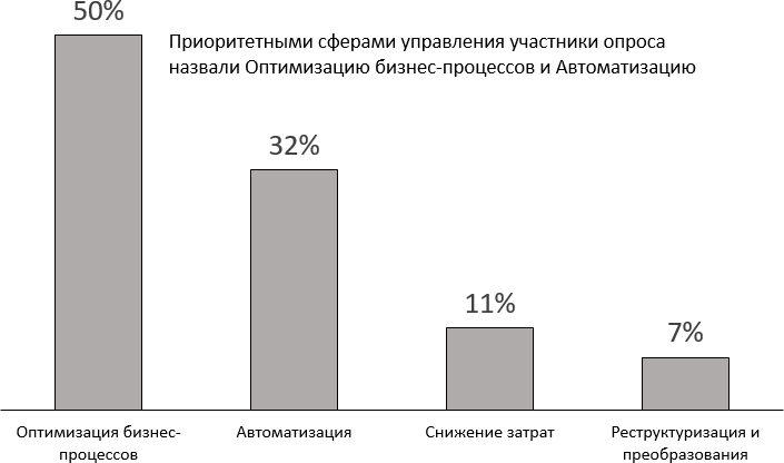 Руководители компаний считают, что наиболее приоритетные сейчас задачи – это оптимизация бизнес-процессов (50 % от числа опрошенных) и автоматизация (32 % от числа опрошенных). Это два направления, о которых мы с вами будем говорить в этой книге. Раскрывая любую тему в управлении финансами, я всегда буду рассказать, как эти процессы можно оптимизировать и автоматизировать.