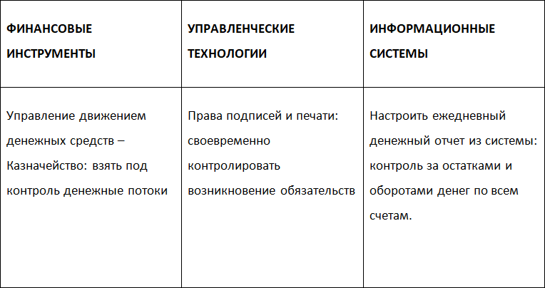 Взгляд финансового директора на управление деньгами в разрезе трех составляющих (финансовые инструменты/управленческие технологии/информационные системы) будет выглядеть следующим образом: