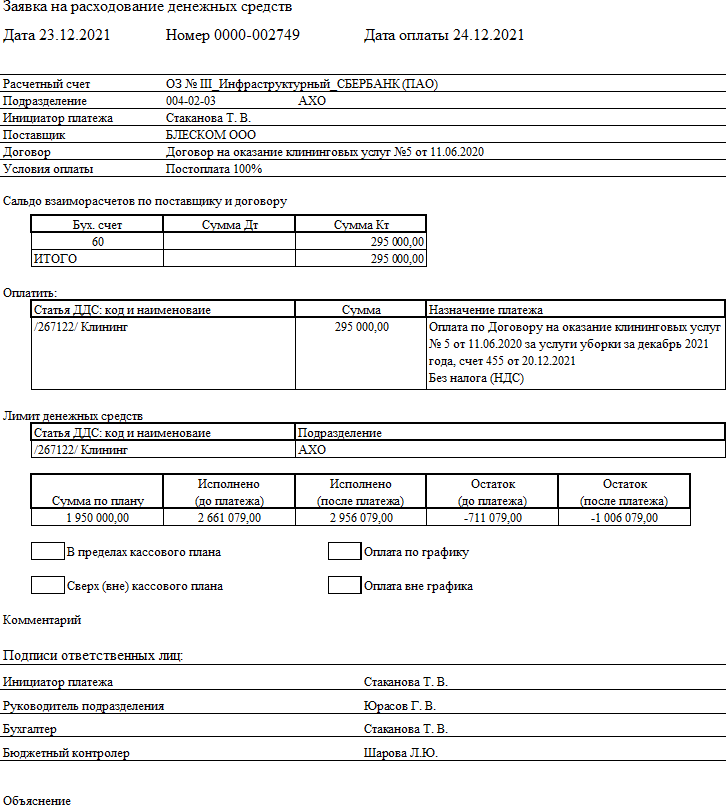 Когда такой документ на оплату приносят казначею или финансовому директору, они, конечно, начнут разбираться в причинах перерасхода бюджета. Менеджер, который оформляет такую Заявку, проставляет «галочку» в поле сверх (вне) кассового плана и в графе Объяснение объясняет перерасход.