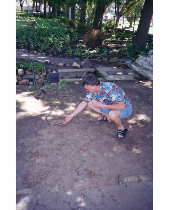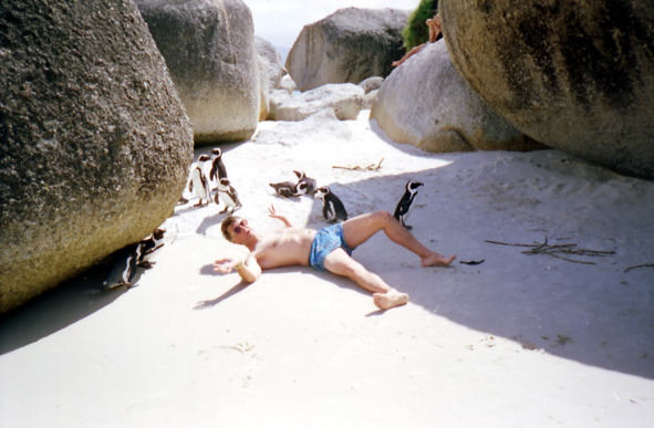 Саймонс Таун оказался военно-морской базой Южноафриканской республики. Мы прошли вдоль всего военно-морского порта с одним военным кораблем и одним кораблем поддержки. По дееспособности и количеству военных судов Южная Африка, как мне показалось, не многим превосходит Новую Зеландию. Путь на пляж нам сначала показал бравый морской офицер (он же объяснил нам и путь в ближайший винный магазин), а затем местная бабулька, которая довела нас до пляжа. Добирались мы туда минут 20—25 и наши дамы (Инна со своими новыми подружками) устали и приуныли, поэтому мы оставили их на пляже, а сами пошли искать приключений дальше. Не пройдя и пятидесяти метров от пляжа, мы обнаружили резервацию пингвинов, открытую для туристов, и вход в которую стоил 10 рандов. Купили билеты и прошли внутрь. Это оказалась довольно большая колония южноафриканских очковых пингвинов и пингвинов Адели. От души поснимав славных птичек мы решили пройти дальше и вскоре натолкнулись на совершенно потрясающий пляж с песком и огромными гранитными валунами (как я потом выяснил, пляж так и назывался: Boulders beach). На пляже, прямо среди людей, деловито бродили те же самые пингвины, ничуть людей не боявшиеся и даже наоборот, норовящие тяпнуть за палец, если кто-то проявлял слишком большую фамильярность. Раскованность пингвинов была столь велика, что когда мы лежали после купания на песке, к нам подошел один из пингвинов и отложил яйцо почти мне под нос. Я был тронут таким доверием. Люди здесь тоже вели себя раскованно. Рядом с нами две голландские лесбиянки загорали в разных позах и ходили купаться совершенно нагими. Из Москвы я взял с собой маску с трубкой и ластами и от души понырял. Дно оказалось очень интересное с большим количеством рыбы, ракушек и прочей живности. Было много огромных, до 5 метров высотой бурых водорослей, которые мы и видели в Аквариуме. К сожалению, вода была не очень прозрачной, вероятно взмутилась после шторма – за пару дней до этого был очень сильный ветер. И, тем не менее, мне удалось достать со дна местную ракушку, размером больше чем с кулак, которую храню до сих пор дома. Примерно в 4 часа по полудни мы сели на обратную электричку и вернулись в Кейптаун.