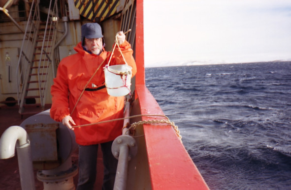 5.Автор отбирает поверхностную морскую воду ведром на ходу судна