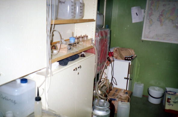 Во время отбора утренней 9 часовой пробы воды ведром, пошёл первый снег в виде крупных белых хлопьев. Очень скоро в углу, у двери лаборатории даже намело небольшой сугроб. После отбора поверхностной воды ведром приступили к своим делам. Саша – фильтровать, Абрамовна – мерить углеводороды, а я мыть полиэтиленовую посуду для будущих работ на Новолазаревской. Посуда оказалась на редкость грязной, т.к. в ней хранились пробы льда и снега с крыши ИОРАН, где стоит станция мониторинга атмосферных осадков. Поэтому я просто залил в нее подкисленной воды, а мыть буду завтра. Короче говоря, завтра у меня будут проблемы с отмыванием этой посуды. На полднике мы встретили поникшего Дениса, который сообщил, что ему в конце концов удалось отловить Леонтьевича, и тот ему сказал, что насчет полета на континент надо было договариваться вчера, а сейчас программа работ на станции Новолазаревская уже утверждена начальником экспедиции Алексеевым и вообще, у тебя мол программа морская, так что и сиди братец на борту, может быть высадишься на Прогрессе, там вроде бы тоже есть озеро. Мы пытались Дэна утешить, как могли. Может в дальнейшем сможем взять его с собой. Саша Новигатский, по-моему, не горит желанием высаживаться на континент. Ему хватило этого во время предыдущего рейса. Ну, а мы с Дениской на новеньких, и горим энтузиазмом.