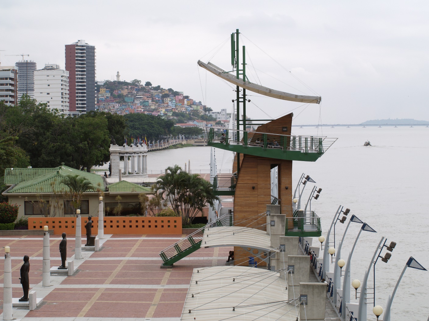 Современная набережная «Malecón Simón Bolívar» или «Malecón 2000» является одним из самых цивилизованных и безопасных мест города. Он представляет собой широкий променад длиной около 3 км с великолепными фонтанами и красивыми скульптурными композициями, отделенный от дорог скверами, ресторанами и кафе. Здесь есть панорамный кинотеатр, детский парк, миниатюрный ботанический сад с мостиками, водоемами и прекрасной флорой. Вдоль набережной реки Guayas уютно разместились солидные правительственные и коммерческие учреждения, рестораны, магазины, развлекательные заведения. Это очень популярное место у местных – по выходным сюда стекается народ, потому как в Гуаякиле больше особо и гулять-то негде. Оригинальная набережная являет собой один из лучших южноамериканских проектов по благоустройству больших общественных пространств. Ежегодно более 12 млн. счастливчиков прогуливаются здесь, наслаждаясь морским воздухом и потрясающими пейзажами. Архитекторам – честь, почет и хвала!