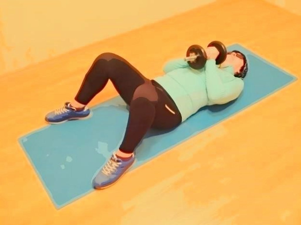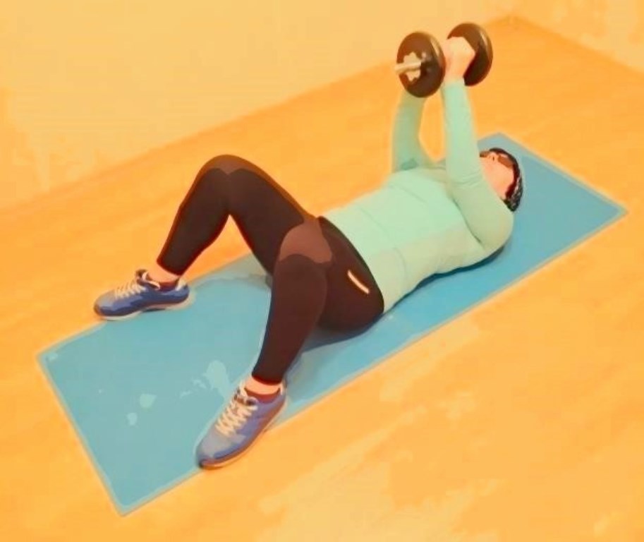 Исходное положение – лёжа на полу, гантель в согнутых руках перед грудью, плечи прижаты к корпусу, ноги согнуты и расставлены в стороны.