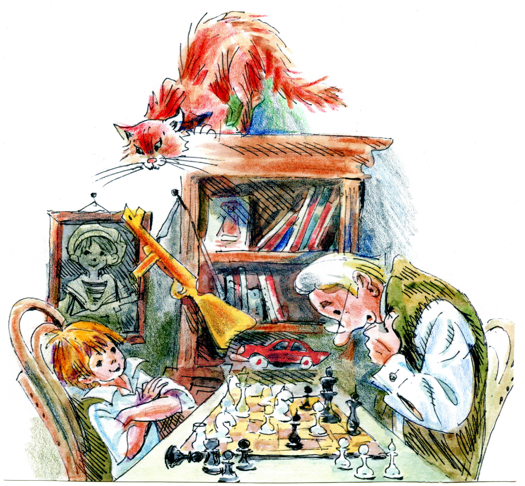 Их сын погиб в детском возрасте. Жалко, конечно, но тягостно приходить в квартиру, где книжки, игры, одежда напоминают о том, кого нет. Для них время остановилось. Мы пьем чай с пирожками, приготовленными тетей Мариной, и играем с дядей Колей в шахматы. Говорят, в шахматах проявляется характер. У меня не хватает терпения, чтобы подолгу продумывать ходы, я импровизирую. Из‑за этого дядя Коля легко обыгрывал меня и жертвовал фигурой, чтобы уравнять шансы. Сейчас я его обыгрываю. Старость. Дядя Коля растерянно смотрит на доску: неужели мат? Мама просит, чтобы я поддавался, не огорчал старика. С шифоньера следит за мной кот Базилио. Это я так прозвал его за огромный размер, вообще‑то он Фунтик. Кот предан своим хозяевам и готов защищать их, как собака. Сделаешь неосторожное движение, он начинает шипеть и изгибать спину к атаке. Несмотря на почтенный возраст, кот лихо прыгает со шкафа на плечи дяде Коле, когда тот командует: «Фунтик!». Дядя Коля не устает из года в год показывать этот фокус. Когда старики умрут, Базилио, наверняка, сядет на их могилу и превратится в памятник.