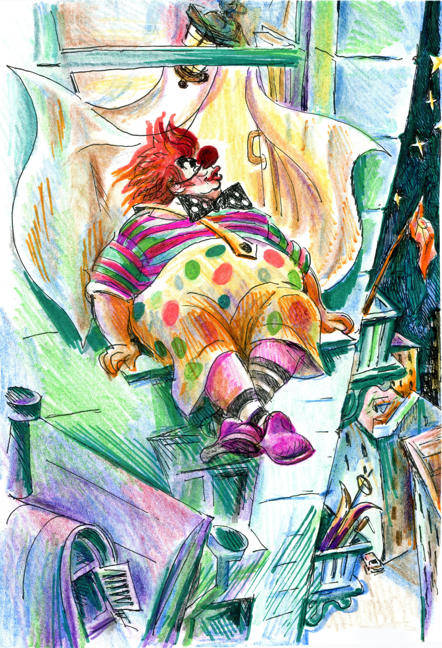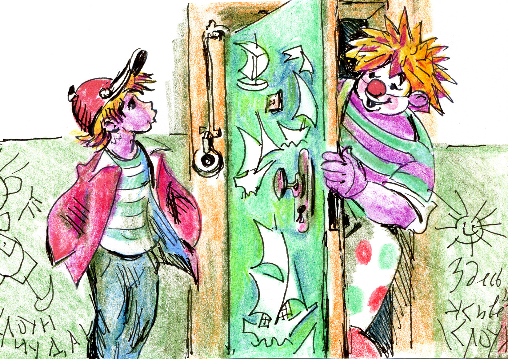 Когда я по лестнице добрался на этот этаж, то увидел дверь, раскрашенную в сине‑зелёные цвета с белыми пятнами. Она неожиданно отворилась, и в проёме появилась голова моего Клоуна.