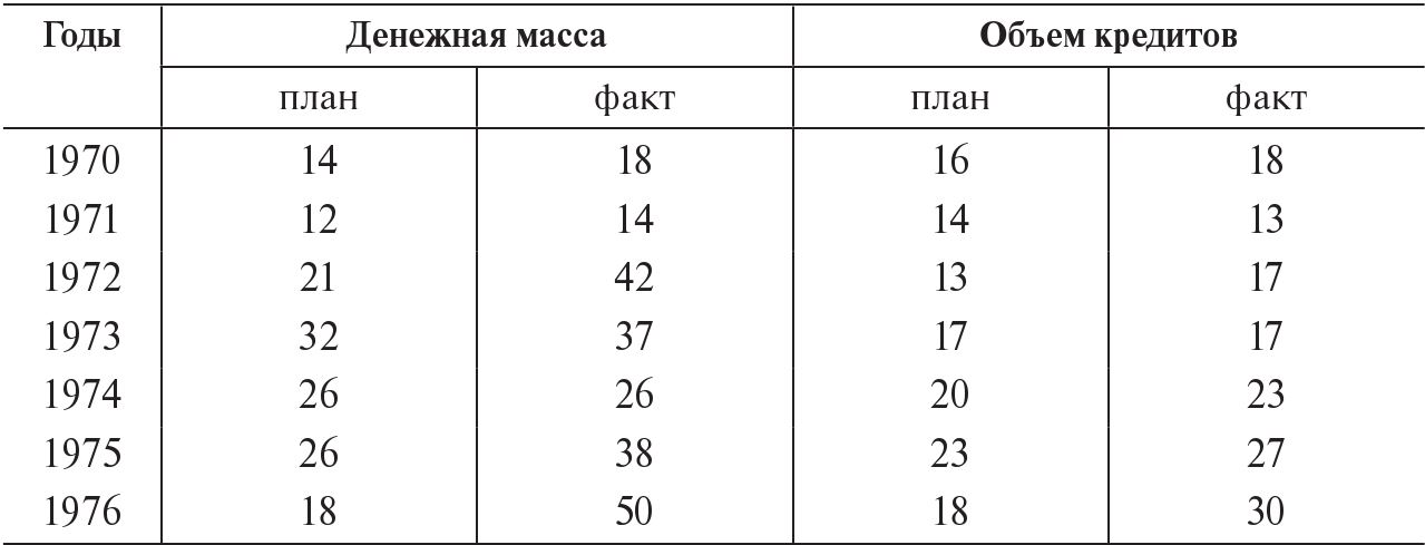 Плановый и фактический темпы прироста денежной массы и кредитов в 1970–1976 гг., %