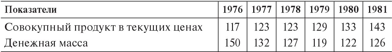 Как следует из таблицы 4, в 1979–1981 гг. рост денежной массы замедлился и стал отставать от номинальных темпов роста экономики, однако это отставание происходило при высоком уровне инфляции: 1979 г. – 20%, 1980 г. – 30%, 1981 г. – 39%.