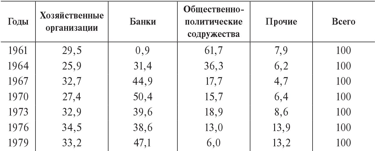 В концепции самоуправляемой экономики важное место занимает проблема расширенного воспроизводства и самофинансирования. Уже в ходе реформы 1965–1967 гг. был выдвинут тезис о превращении предприятий в основных субъектов расширенного воспроизводства. Банки в новой системе должны были играть вспомогательную роль в реализации межотраслевого перераспределения инвестиций. Однако на самом деле в течение 1960–1970 гг. роль банков в инвестиционном процессе возросла, а роль предприятий – осталась прежней (табл. 5).